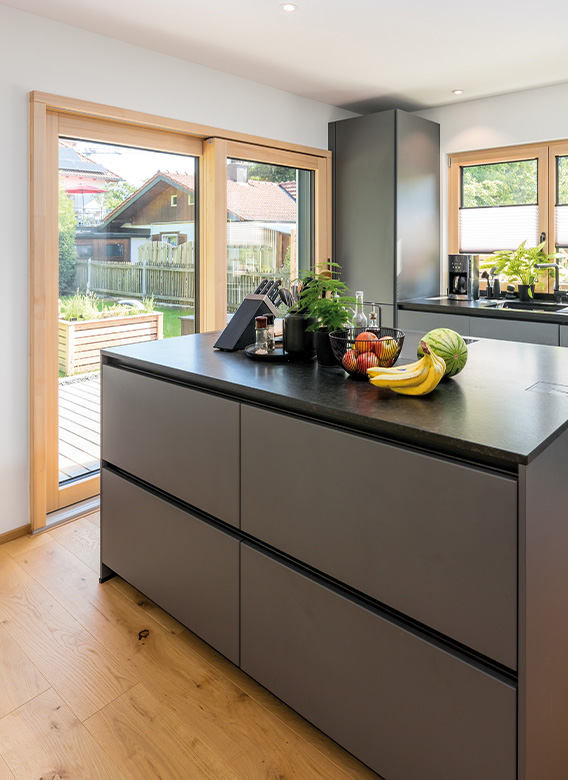 Das Hauptgebäude bietet alles, was eine Familie braucht: ein großzügiges Elternschlafzimmer, ein großes Kinderzimmer und Arbeitszimmer mit viel Licht, ein Wellnessbad sogar mit Zugang zum Loggia-Balkon, der wie eine kleine Oase der Ruhe auf dem Bungalow thront. Die Wohnküche mit Kochinsel öffnet sich zum weitläufigen Wohn- und Essbereich genauso wie zur einladenden Terrasse und dem schönen Garten. Ein zusätzlicher Raum im Erdgeschoss mit eigenem Zugang zur Verbindungsterrasse und nahegelegenem Duschbad kann flexibel genutzt werden.