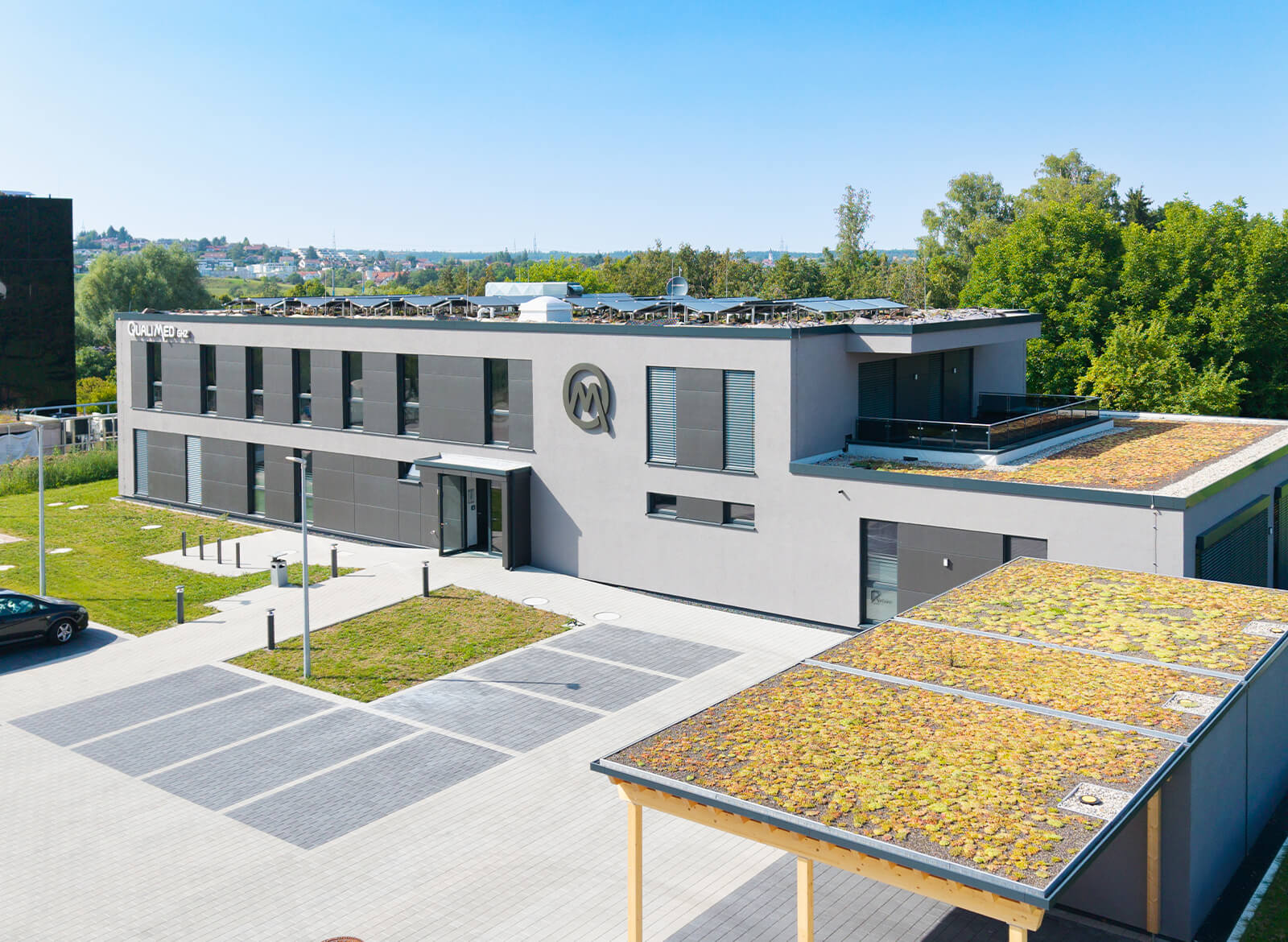 Das energetische Konzept erfüllt die Anforderungen des GEG 2023 und unterschreitet den zulässigen Jahres-Primärenergiebedarf um mehr als 42 %. Eine Luft-Wasser-Wärmepumpe mit Fußbodenheizung, ergänzt durch eine Abluftanlage für innenliegende Räume, stellt eine effiziente Gebäudeklimatisierung sicher. Auf dem Flachdach produziert eine PV-Anlage erneuerbaren Strom. Dach- und Carportbegrünungen sowie die Außenanlagen runden das nachhaltige Gesamtkonzept ab.