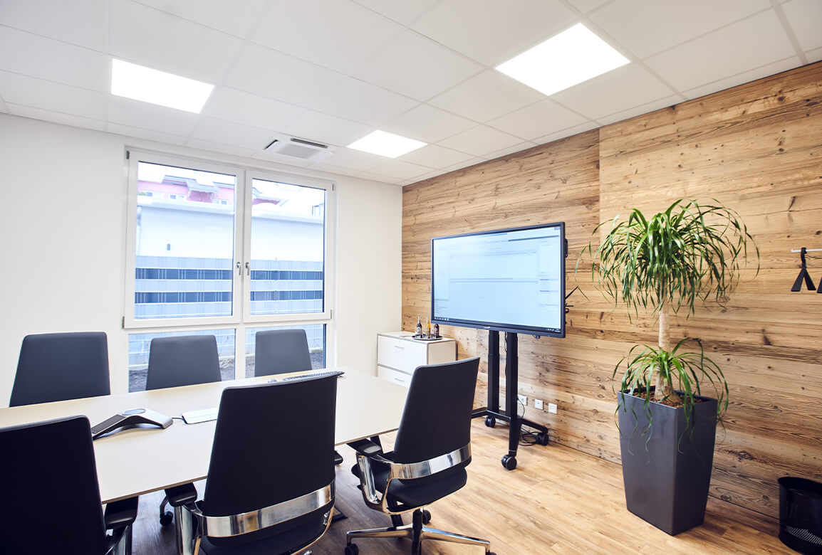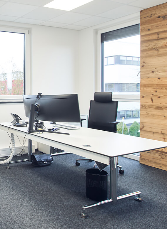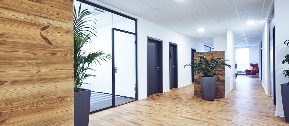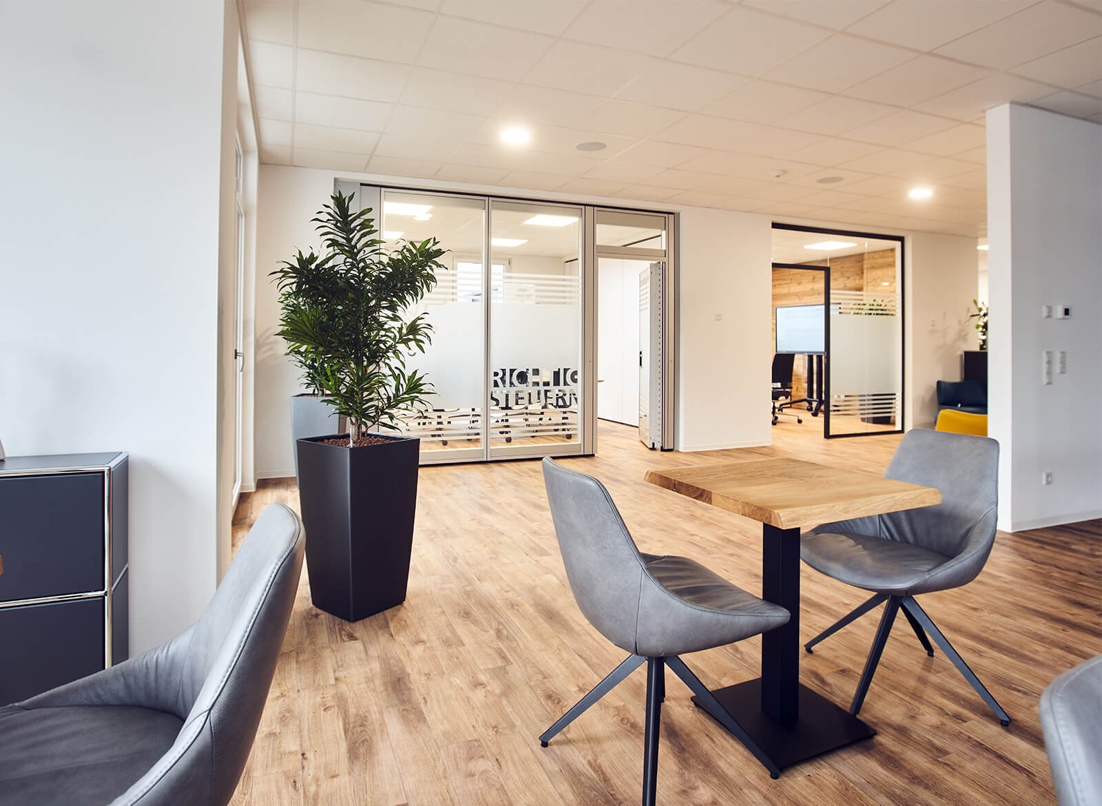 Innen überzeugt das Objekt durch ein durchgängiges Gestaltungskonzept aus warmen Holzoberflächen, modernen Glaselementen und hochwertigen Materialien. Empfang, Besprechungsräume und Bürobereiche sind lichtdurchflutet, funktional und zugleich repräsentativ gestaltet. Offene Zonen fördern Kommunikation, während geschlossene Räume konzentriertes Arbeiten ermöglichen.